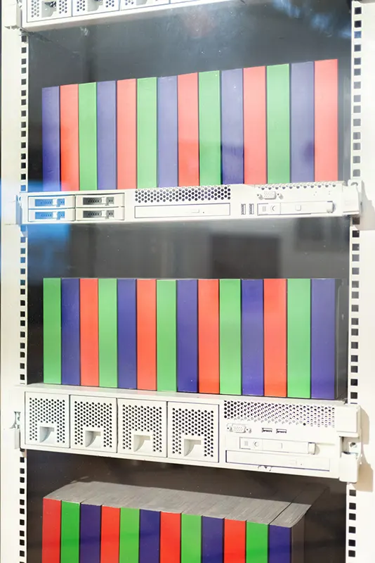56 folioscopes distibués sur 4 palettes et dans un rack serveur blanc.